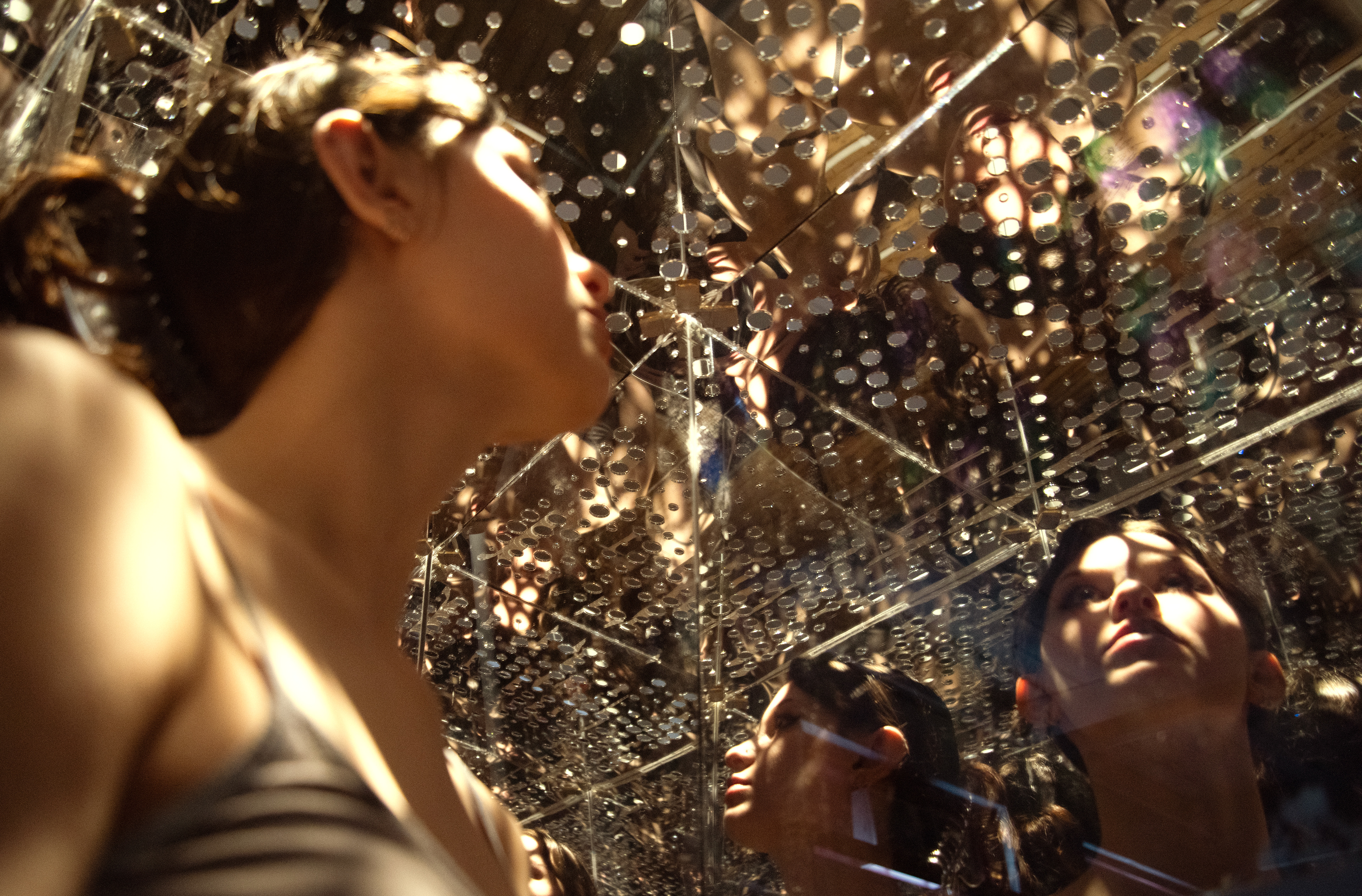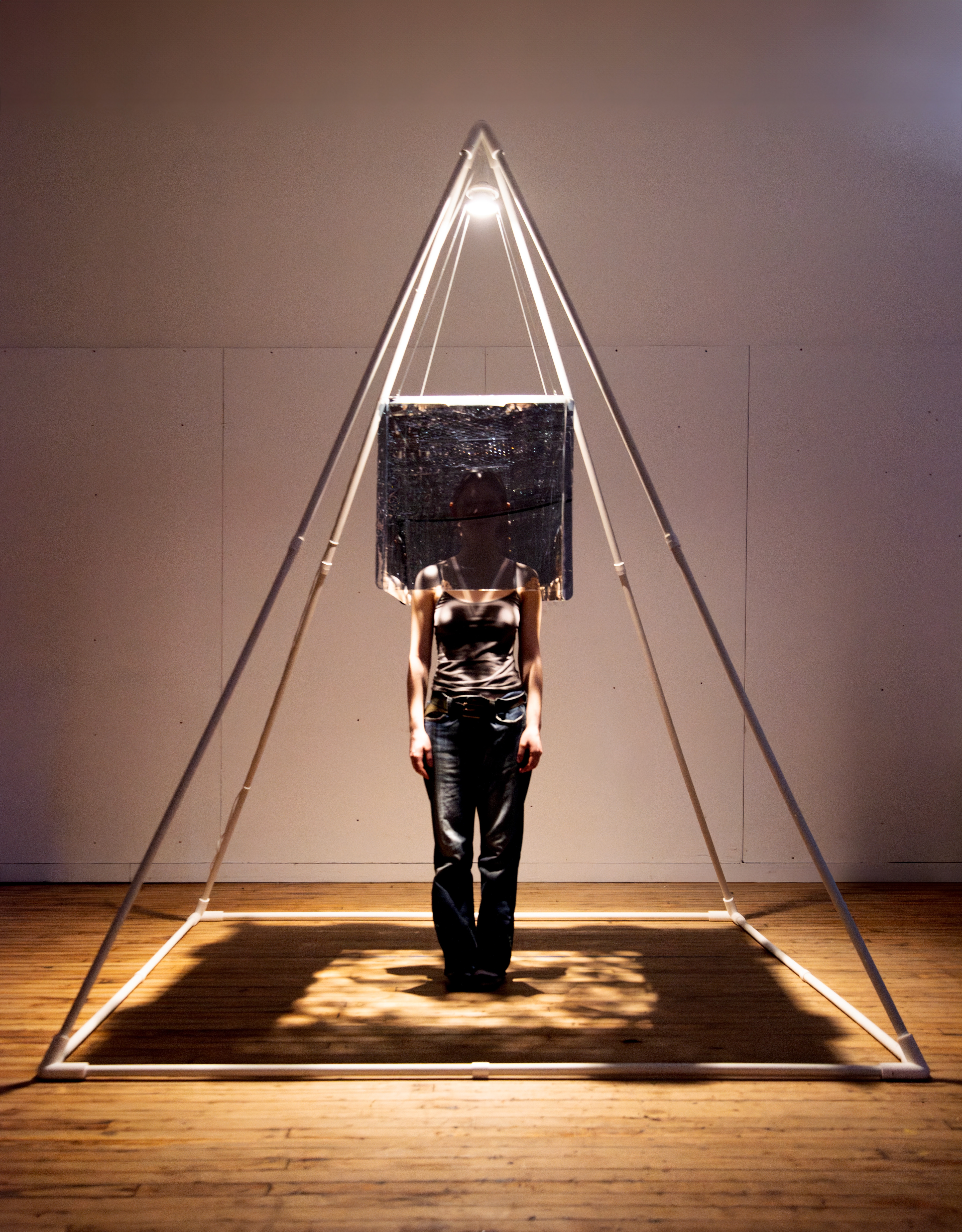 A “self-reflection” art installation simulates isolation through technology, highlighting the oxymoron of “spatial computing” within the envelope of the social experience. It is symbolic of strapping on a pair of the latest VR goggles whose digital light projections immerse the user at the expense of togetherness. They are trapped in a box of their own awareness while others mockingly watch them from the outside through the broken fourth wall.